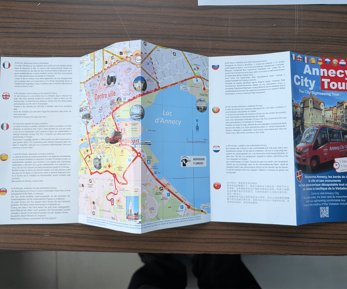 Parmi nos récentes réalisations : un dépliant 10 pages pour une boutique de location de vélos à Annecy. Conçu comme un miniguide touristique, ce support multilingue (9 langues !) propose un mini-plan de la ville et met en avant des lieux incontournables à visiter à vélo.